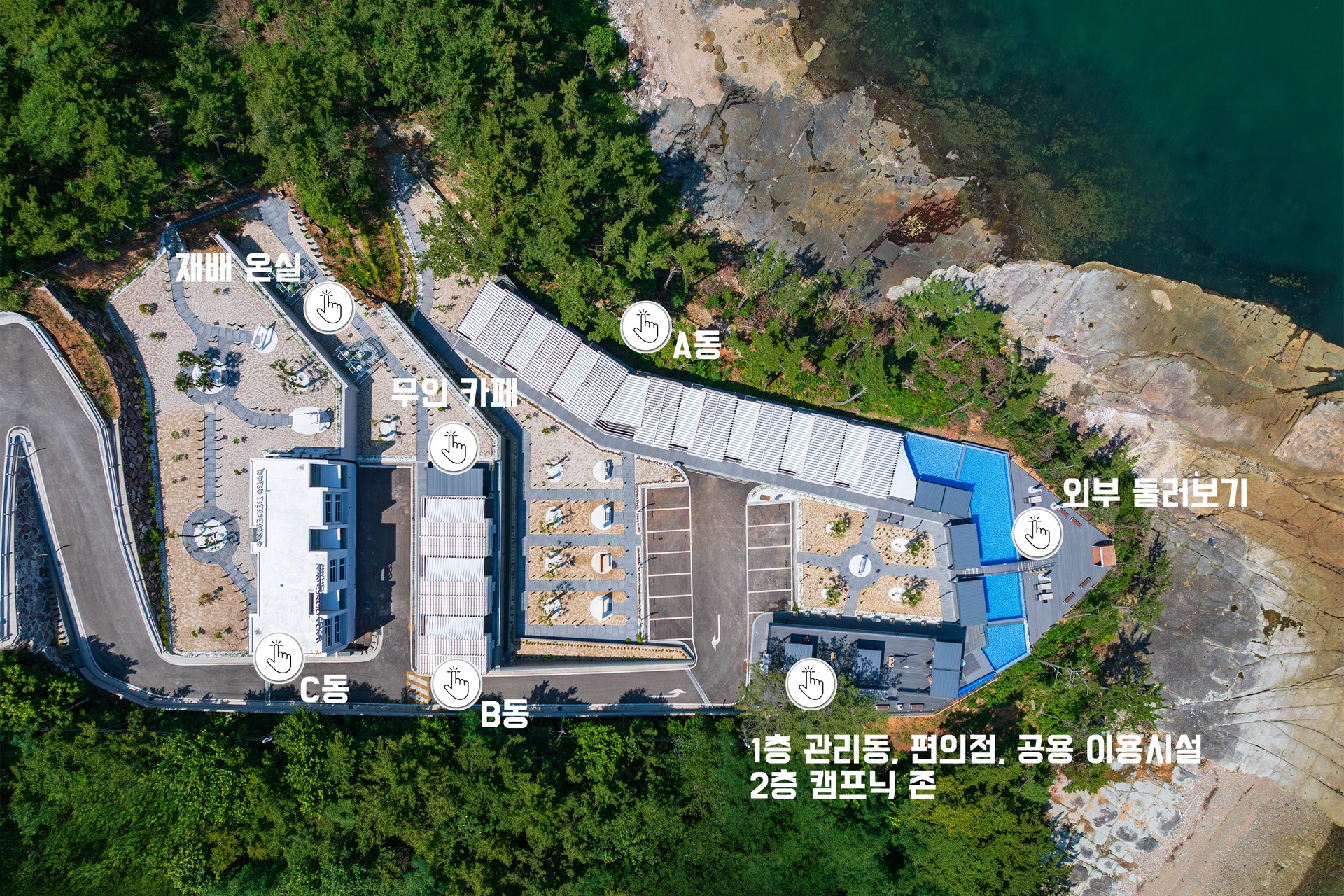 전면으로 인피니티풀 그리고 정원뷰와 섬이 어울어진 오션뷰를 만끽 할 수 있으며, 무인 카페와 수경 재배 온실이 가까운 B동 객실입니다.